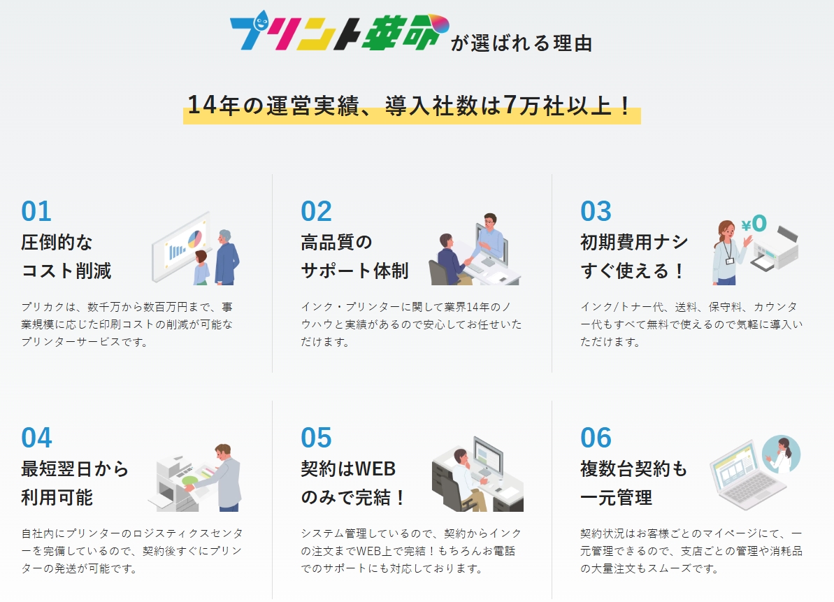 従来のプリンター利用にかかる費用や手間――高額なリース契約、インクの買い足し、修理費などの負担をゼロにし、「本当に必要な印刷」に集中できる環境を整えてくれるのがプリント革命です。