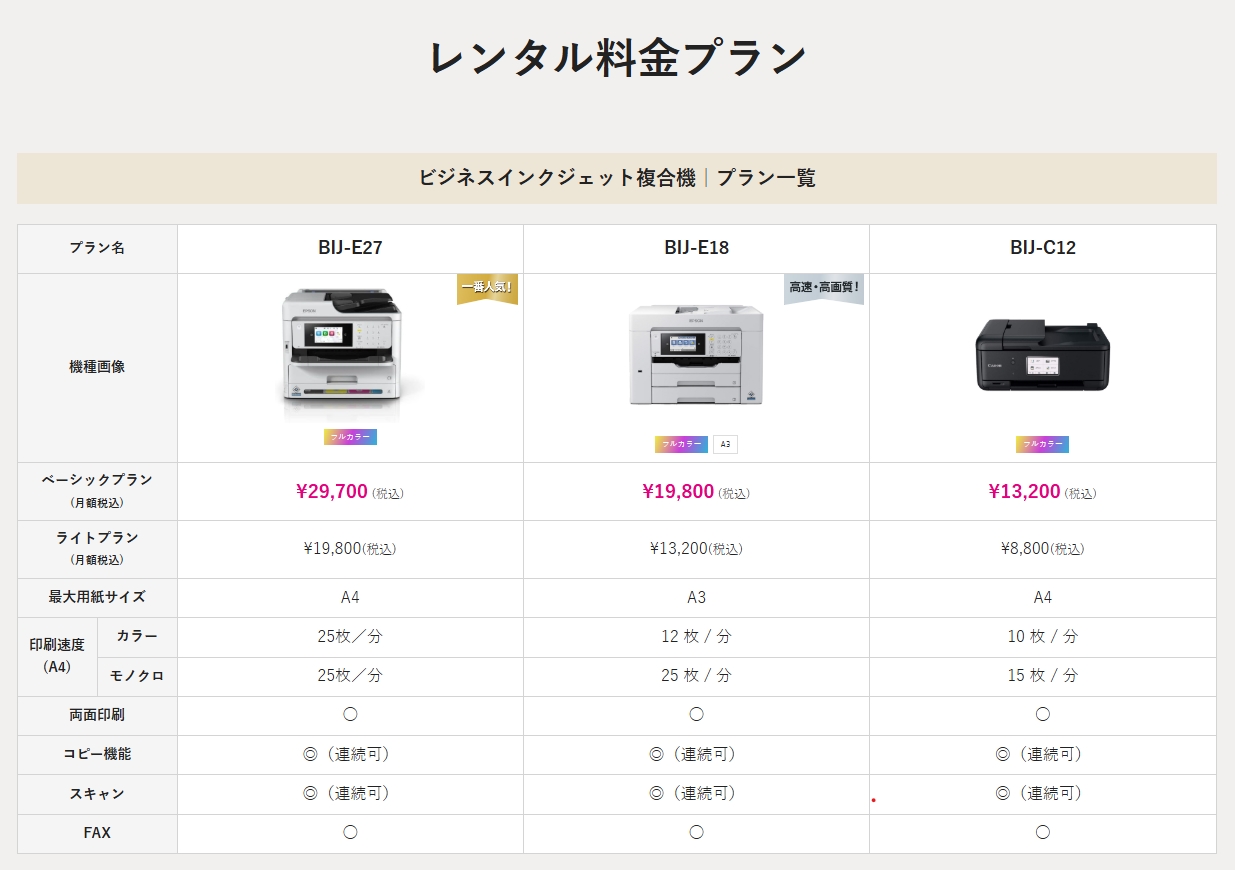 ※どのプランも、インク代・本体代・送料・保守費用すべて込み
